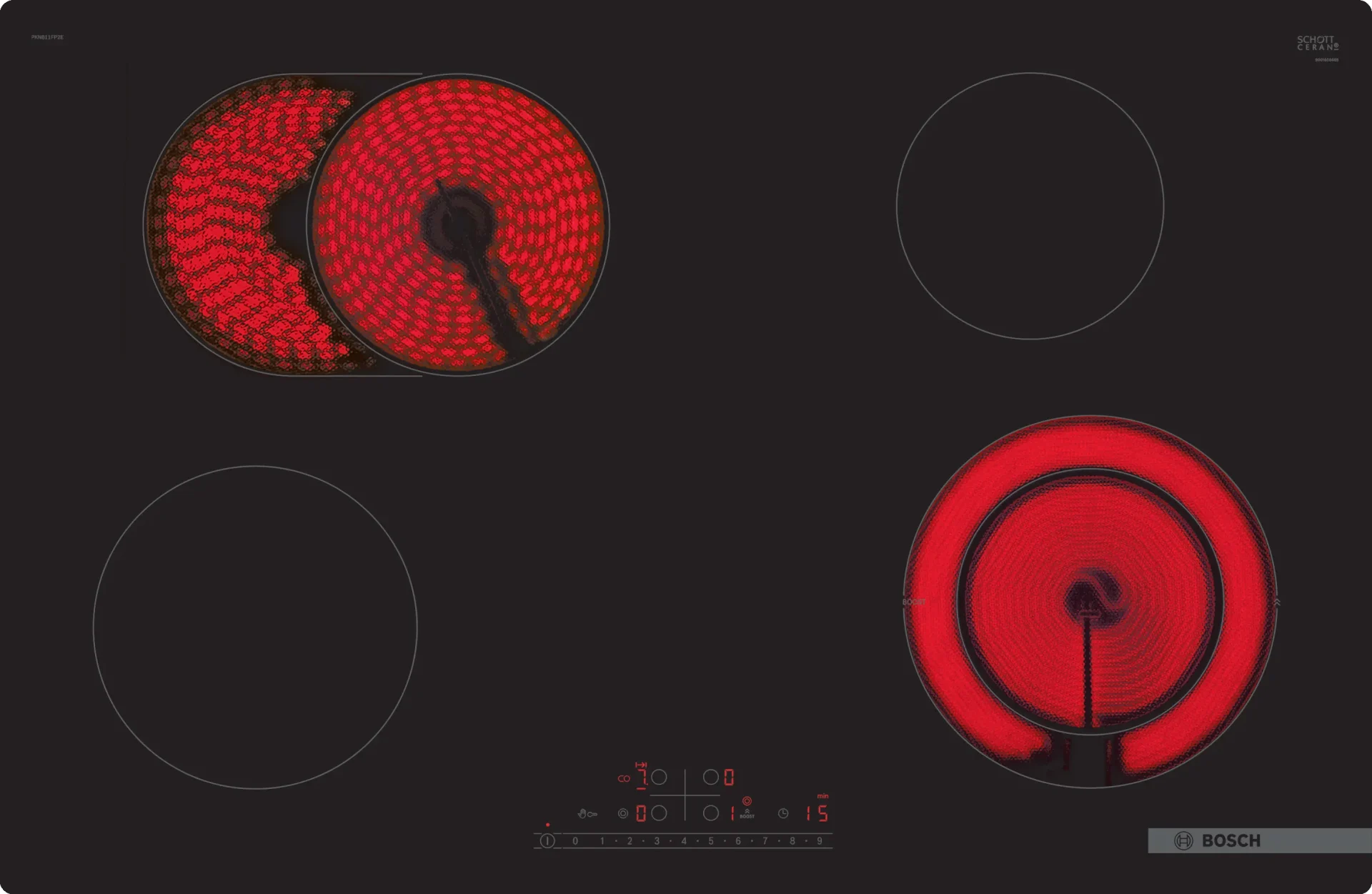 • تسخين فعال: الشعلة الخلفية اليسرى (1.2 كيلو وات)، الشعلة الأمامية اليسرة (1.8 كيلو وات)، الشعلة الوسطى (2.7 كيلو وات)، الشعلة الخلفية اليمنى (1.8 كيلو وات)، الشعلة الأمامية اليمنى (1.2 كيلو وات)، إجمالي الطاقة 8.7 كيلو وات.