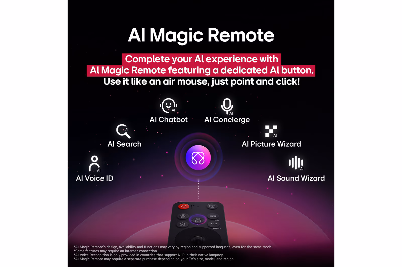 - نظام webOS مع AI Magic Remote يتيح لك البحث الذكي AI Search، والروبوت الذكي AI Chatbot، والمساعد الذكي AI Concierge، بينما يقوم برنامج webOS Re:New بتحديث الجهاز سنويًا لمدة 5 سنوات.